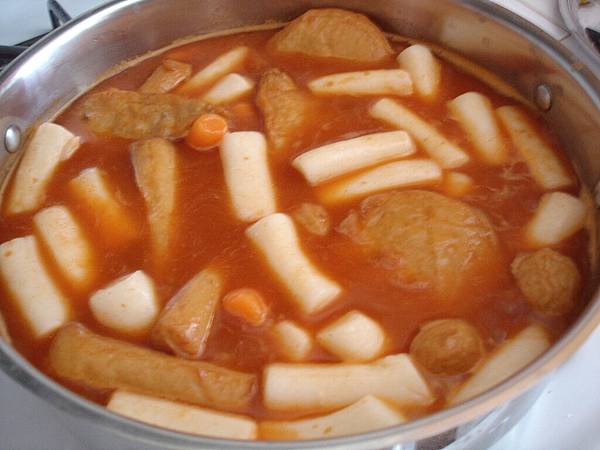 將年糕, 甜不辣, 和紅蘿蔔放入水中, 滾開後加入2-4大匙韓式辣椒醬, 想吃辣一點就多加一匙,