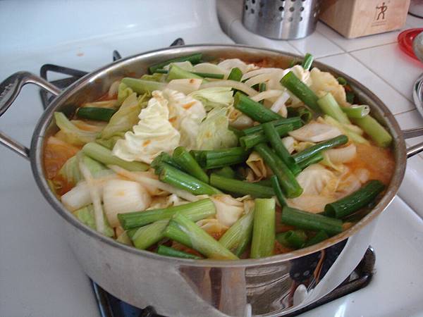 最後加入切好的高麗菜, 洋蔥和青蔥, 攪拌攪拌, 等水滾開