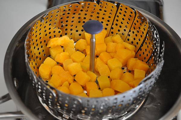 將squash切丁後放入BASKET擺滿, 接著隔水加熱