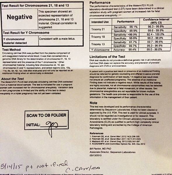報告就是一張紙, 十分陽春, 寫著陰性, 然後有Y, 所以是男生